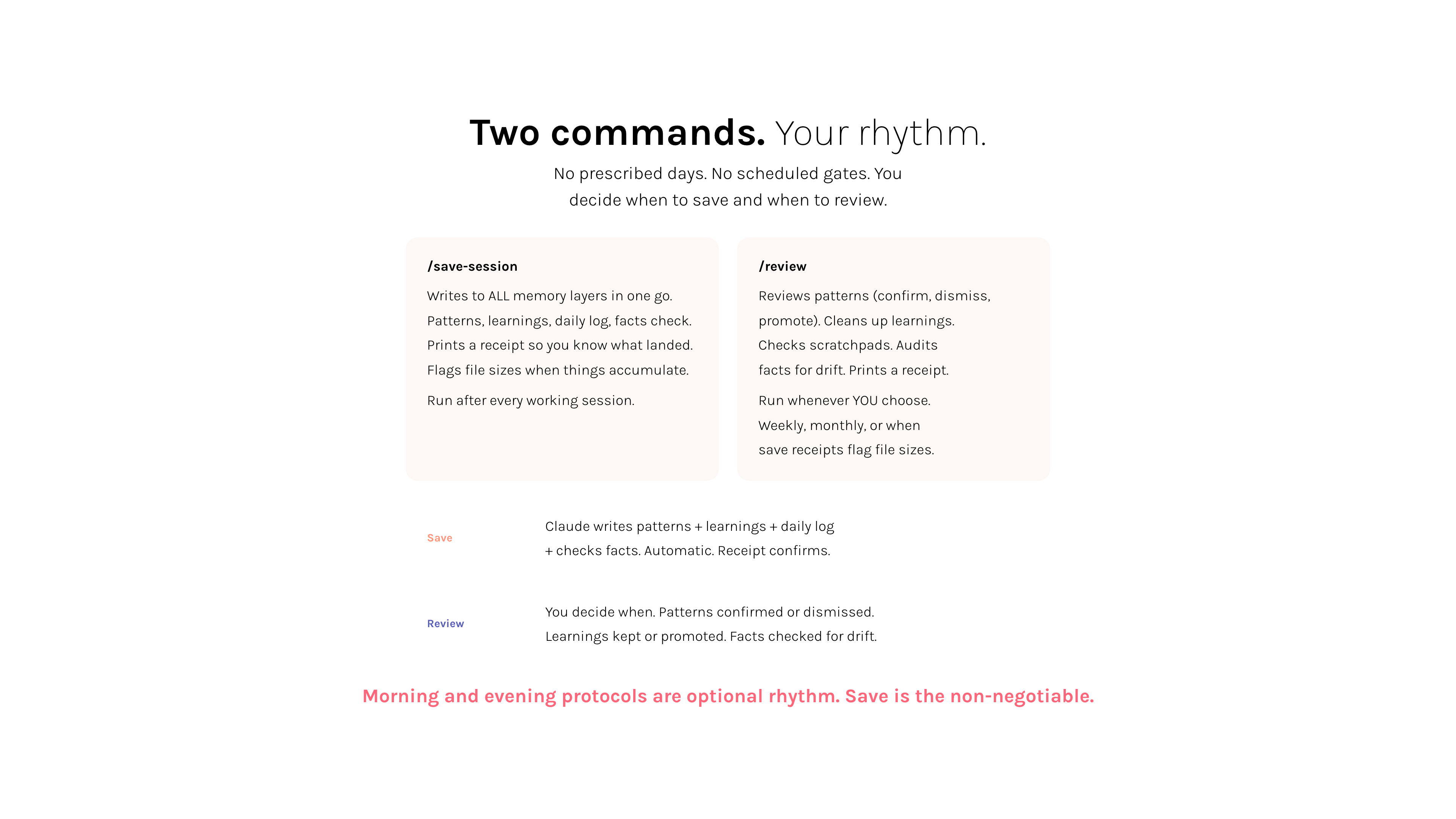 Patterns are observations about you. Your wording, choices, emotional tells, repeated phrases, energy shifts. Claude appends one to patterns.md at every save. If nothing came up, it skips silently. When you run /review, Claude mirrors the patterns back to you in neutral observation format. You confirm, dismiss, or promote them to a structural fact. No opinions, no judgement, no coaching. You decide what is real.