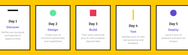 Each day comes with it's own goals and deliverables. By participating in all the 5-steps, you can be certain that your AI is solving a real business problem you have.