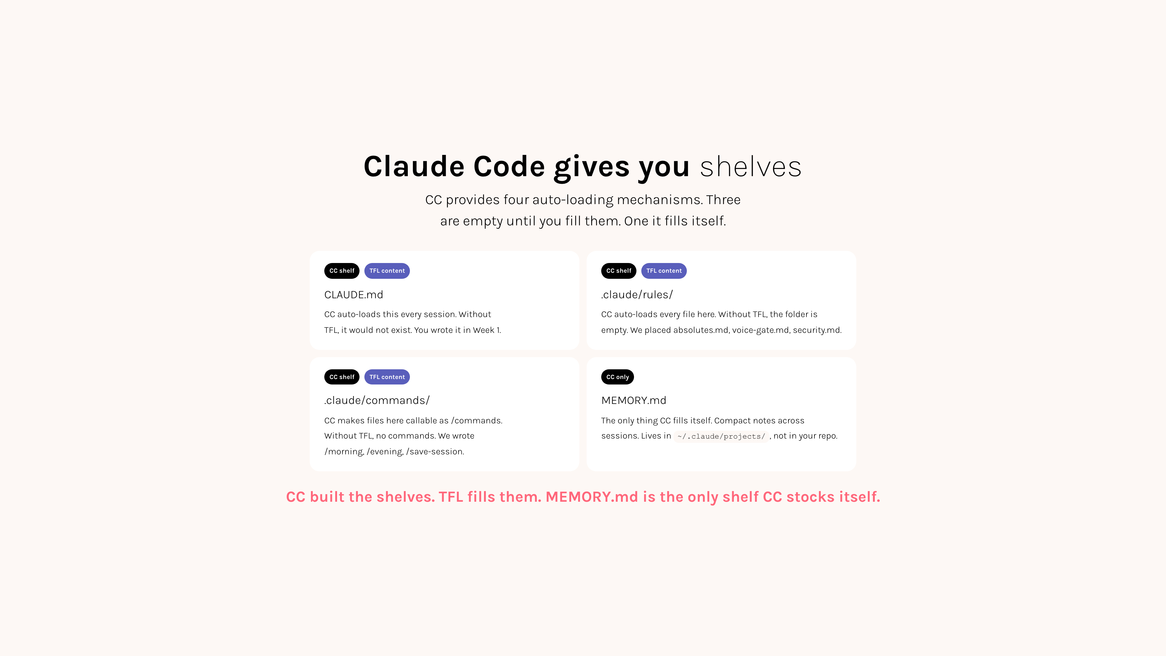 What Claude reads at the start of every new session falls into two groups: things Claude does natively (built into Claude Code itself), and things your Four Languages root system adds on top.